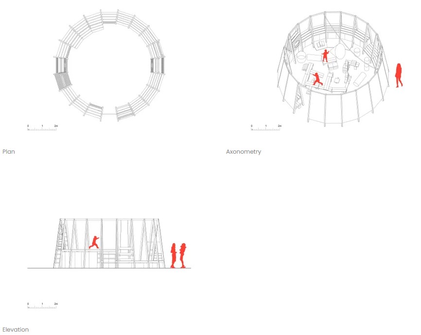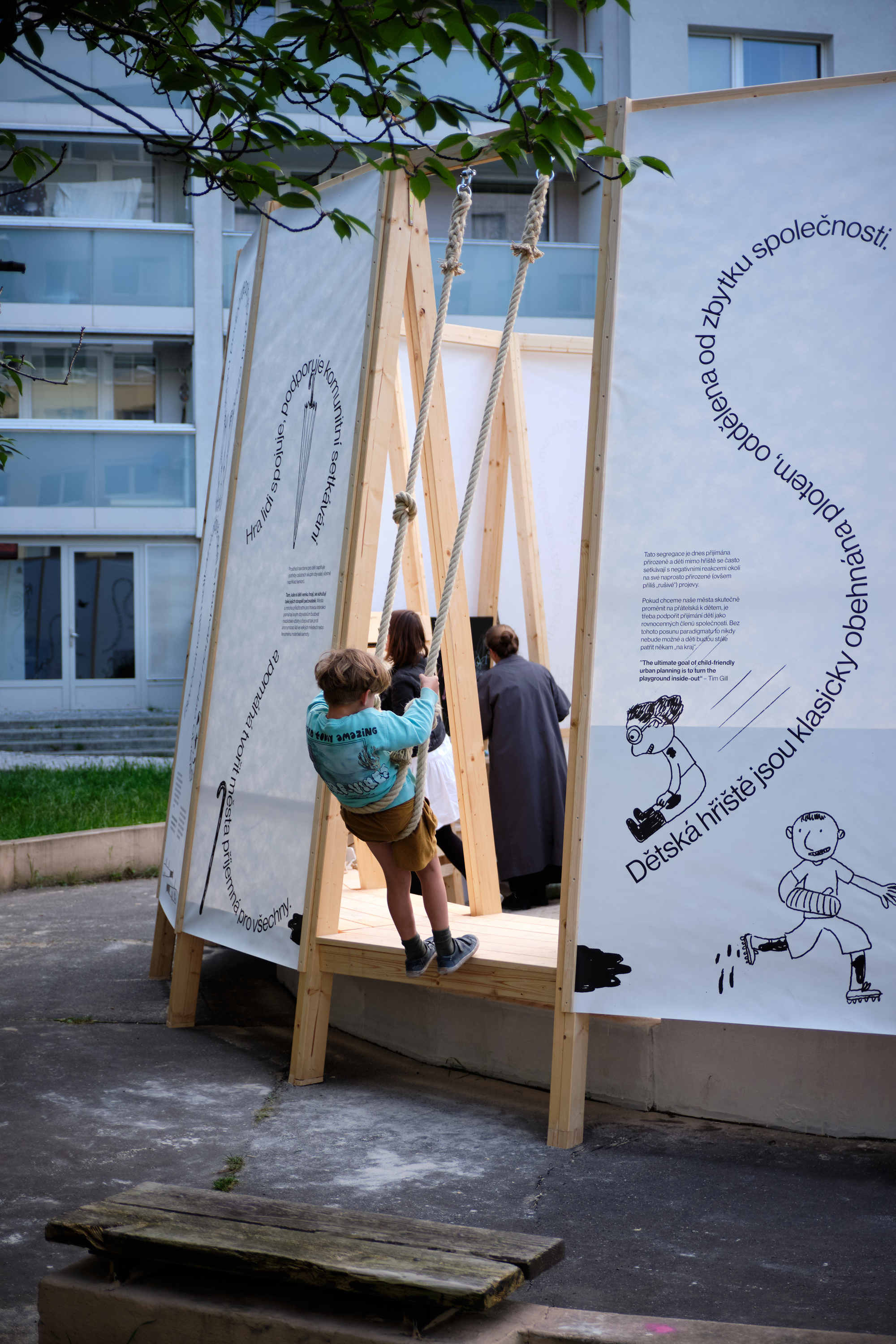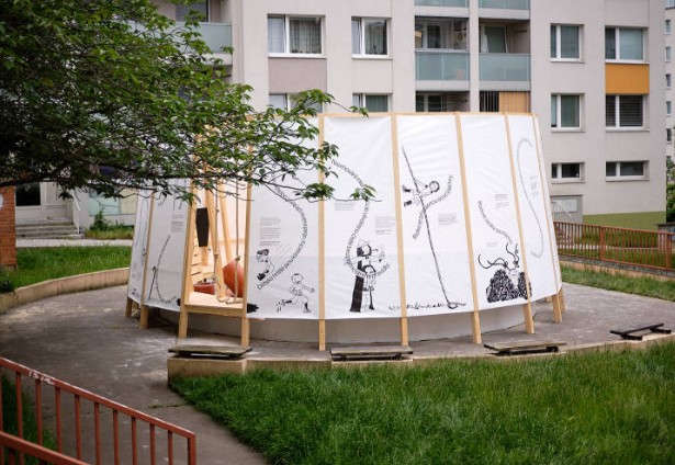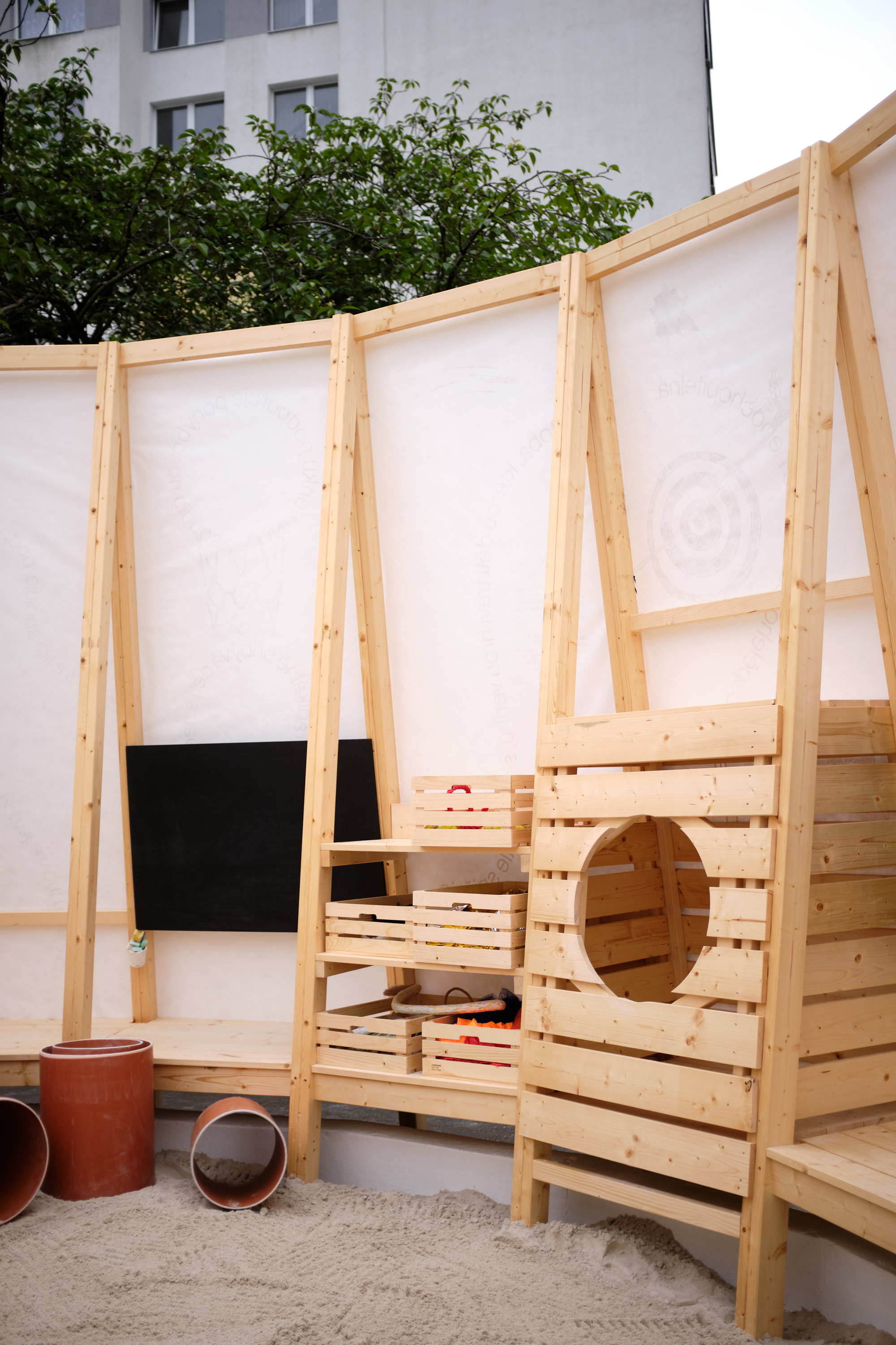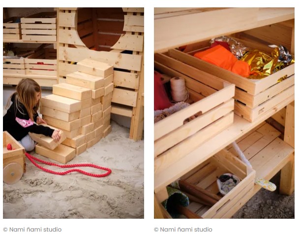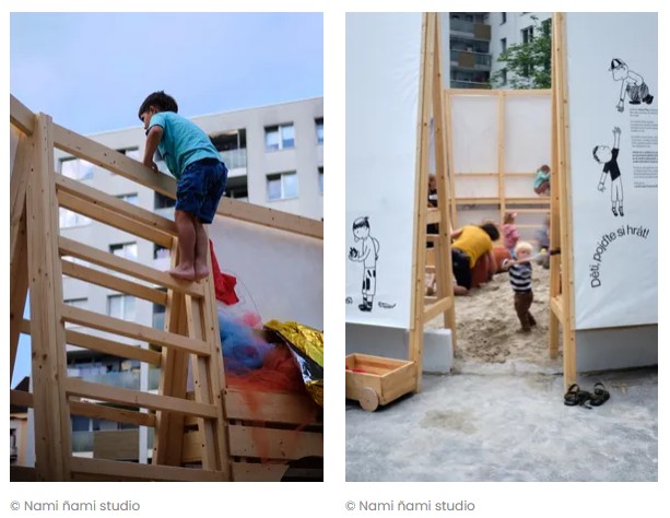 Ohraničený prostor ze stěn ze smrkového dřeva vyplněný pískem, se zabudovanými lavicemi, úkryty, úložnými prostory, tabulí na kreslení, šplhacími lany či žebříky. Dětské hřiště pro volné dětské hry inspirované Nami Play Pavilion (je dětský pavilon, který vznikl v rámci pražského Landscape Festivalu) od Nami ñami studio. https://architectures.jidipi.com/j00101536/en/nami-play-pavilion.
